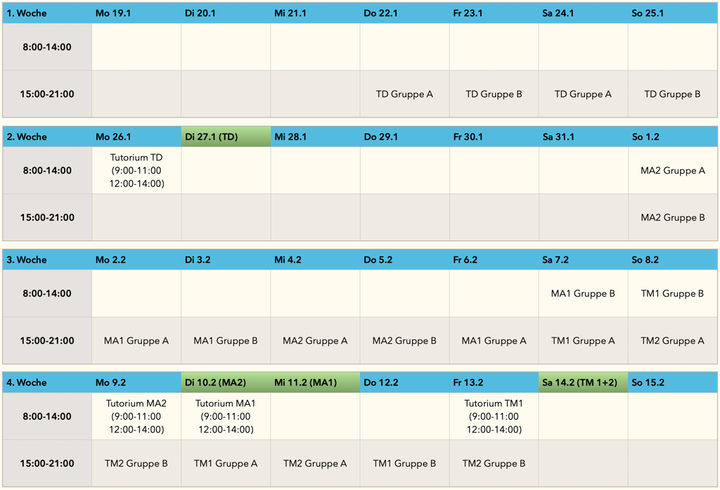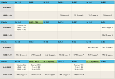 Darüber hinaus besteht die Möglichkeit, an einer abschließenden Wiederholungssitzung einen Tag vor der Klausur teilzunehmen. In dieser 1–2-stündigen Session können offene Fragen geklärt werden, um die Prüfung mit Sicherheit und gutem Gefühl anzugehen.